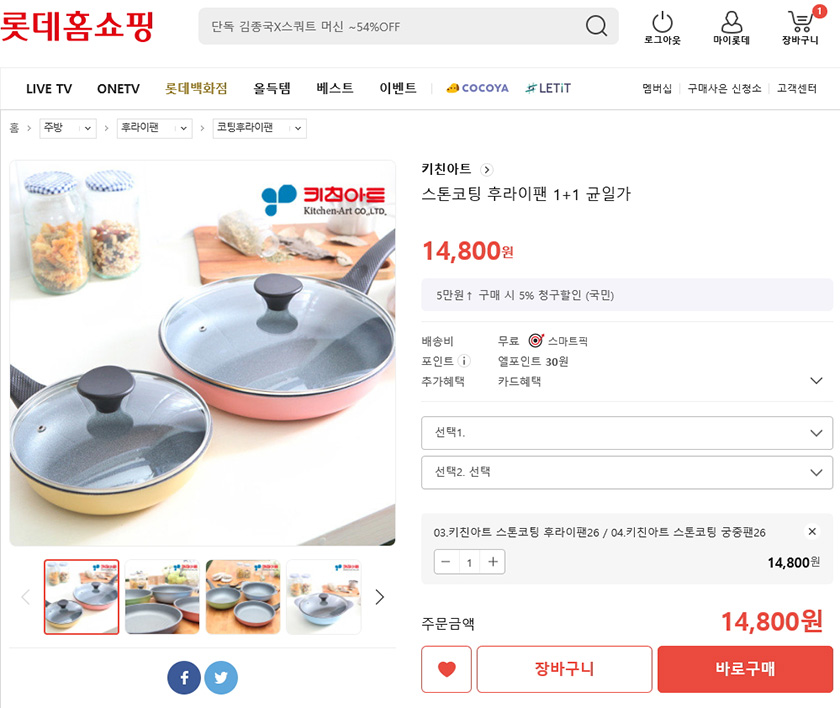 키친아트 스톤코팅 후라이팬 1+1 균일가 (14,800원) 에요..
