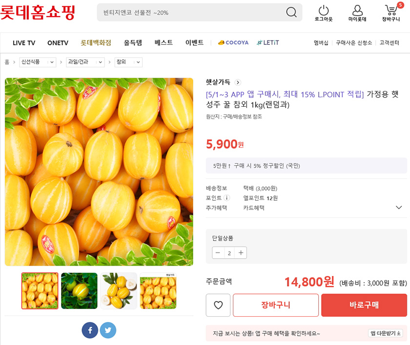 오늘은 롯데홈쇼핑의 햇살가득 가정용 햇 성주 꿀 참외를 소개해 드릴께요ㅎㅎ