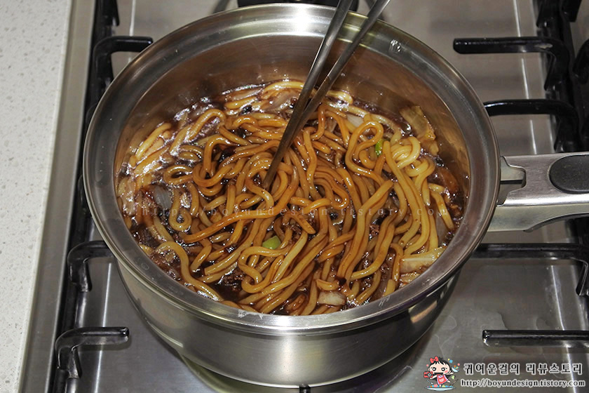 돼지고기의 고소한 풍미가 살아있는 전문점 맛의 짜장소스가 잘 배도록 강불에서 2분30초간 더 볶아주었어요..