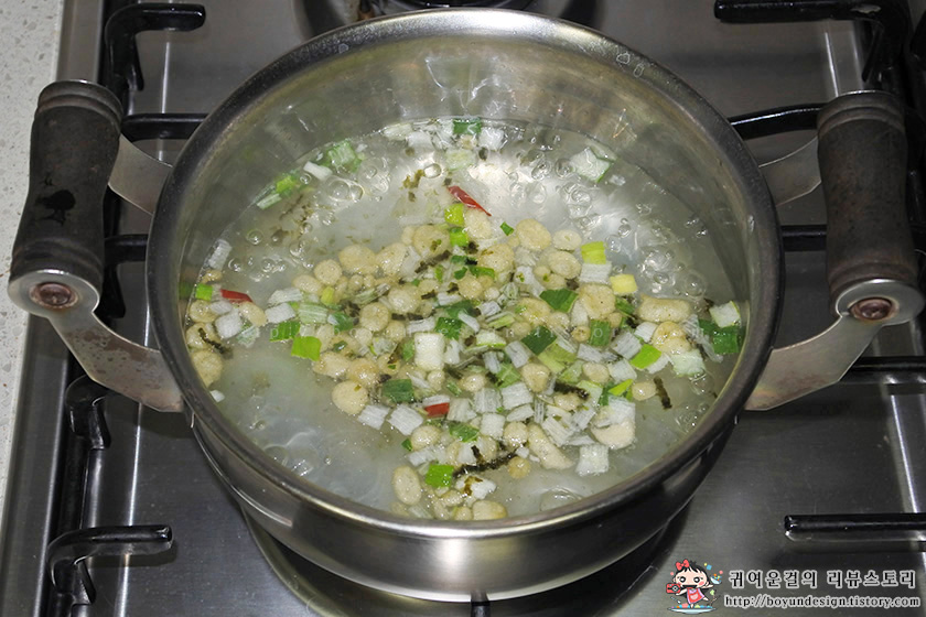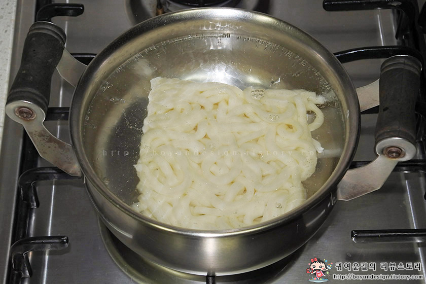 뜨거운 물에 우동건더기를 20~30초간 데쳐주었어요..