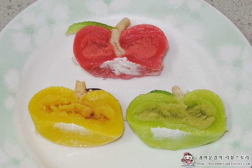 알록달록 예쁜 3가지 색상의 사과 속에는 각각 같은 색상의 앙금이 듬뿍~