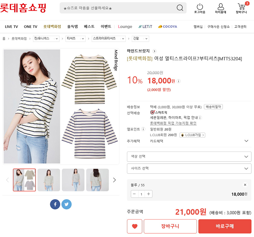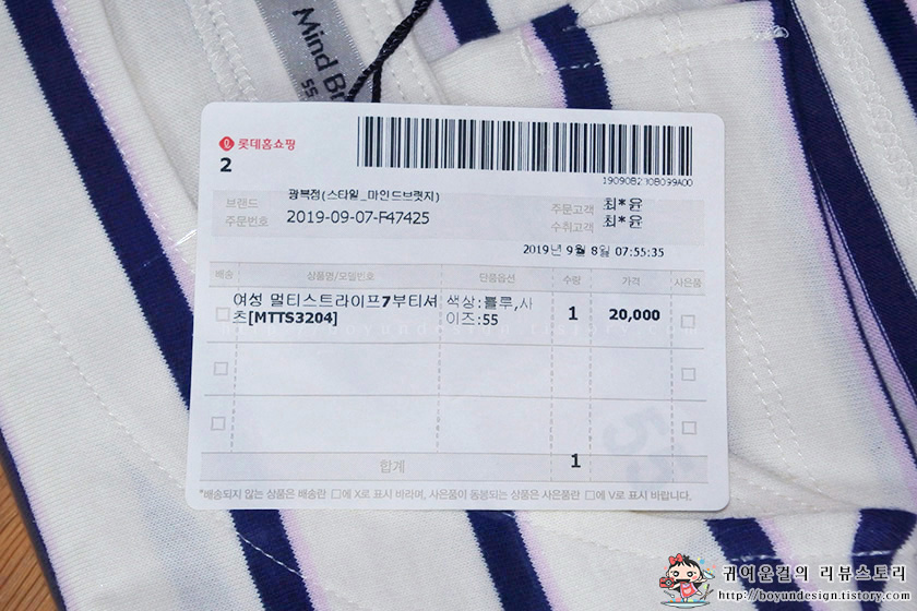 그럼, 귀여운걸과 함께 롯데홈쇼핑 롯데백화점 마인드브릿지 여성 멀티스트라이프7부티셔츠를 살펴볼까요?^^