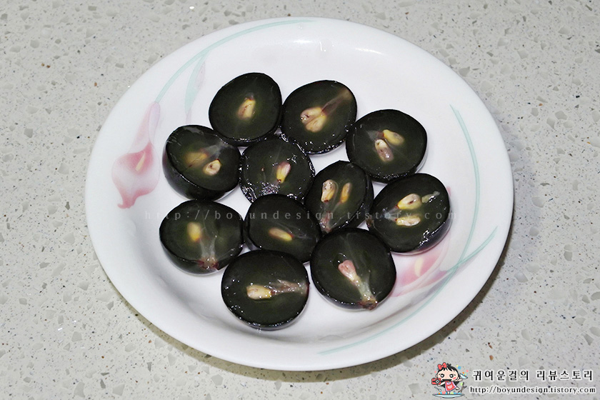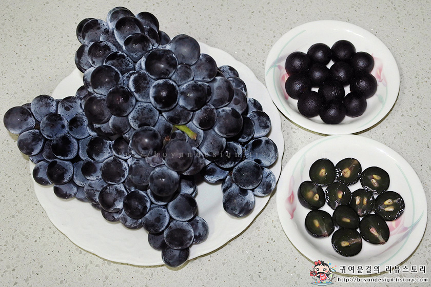 큼직한 포도 알갱이 속에는 탱글탱글 속살과 씨가 콕콕 박혀 있었어요~