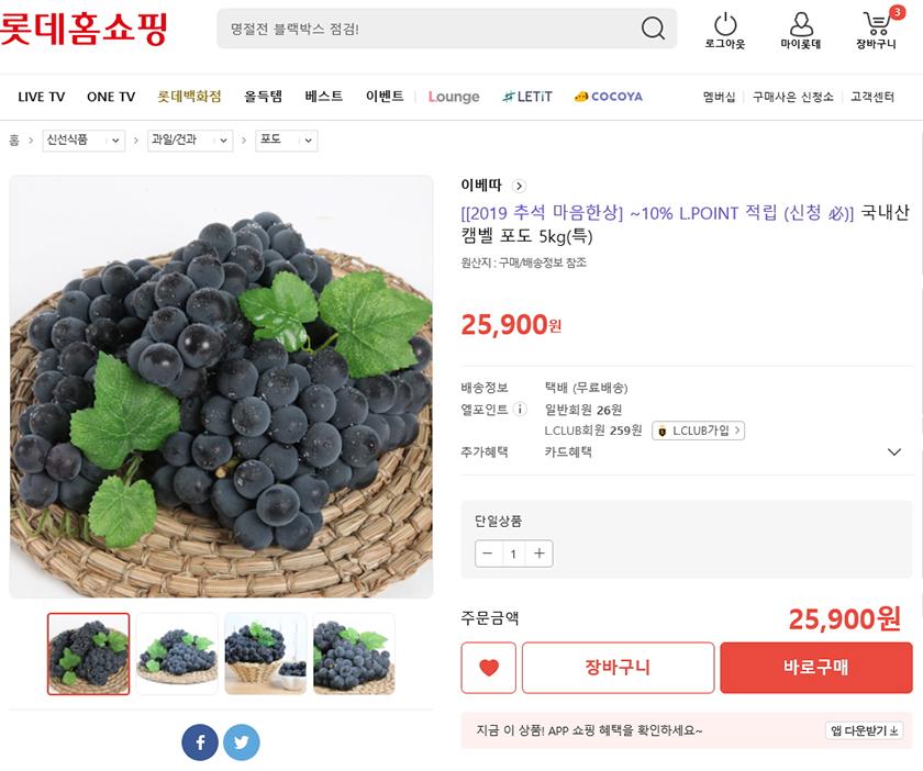 오늘은 롯데홈쇼핑의 이푸룸 마음담은 사과이베따 국내산 캠벨 포도 5kg(특)을 소개해 드릴께요ㅎㅎ