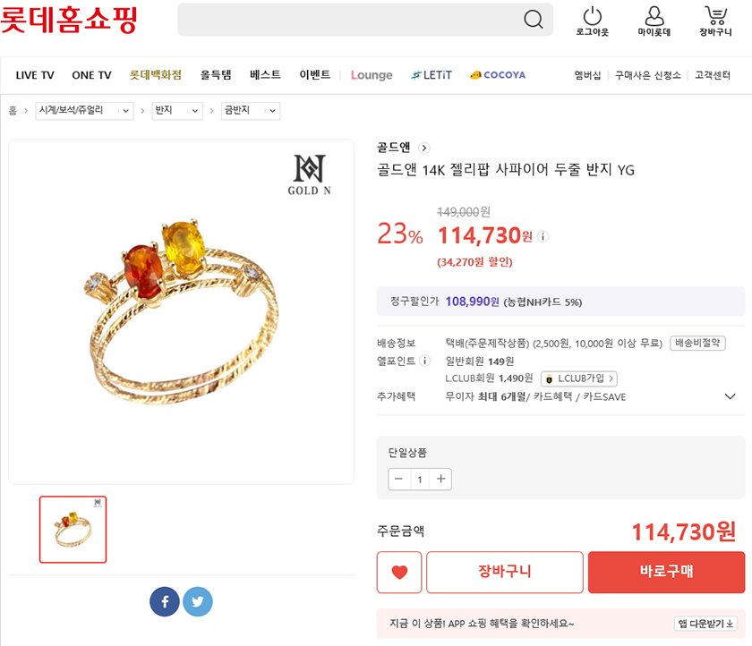 오늘은 롯데홈쇼핑의 골드앤 14K 젤리팝 사파이어 두줄 반지 YG를 소개해 드릴께요ㅎㅎ