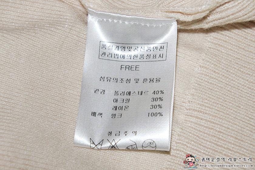 겉감 소재는 폴리에스테르 40%, 아크릴 30%, 레이온 30%, 배색은 밍크로 구성되어 있었어요~