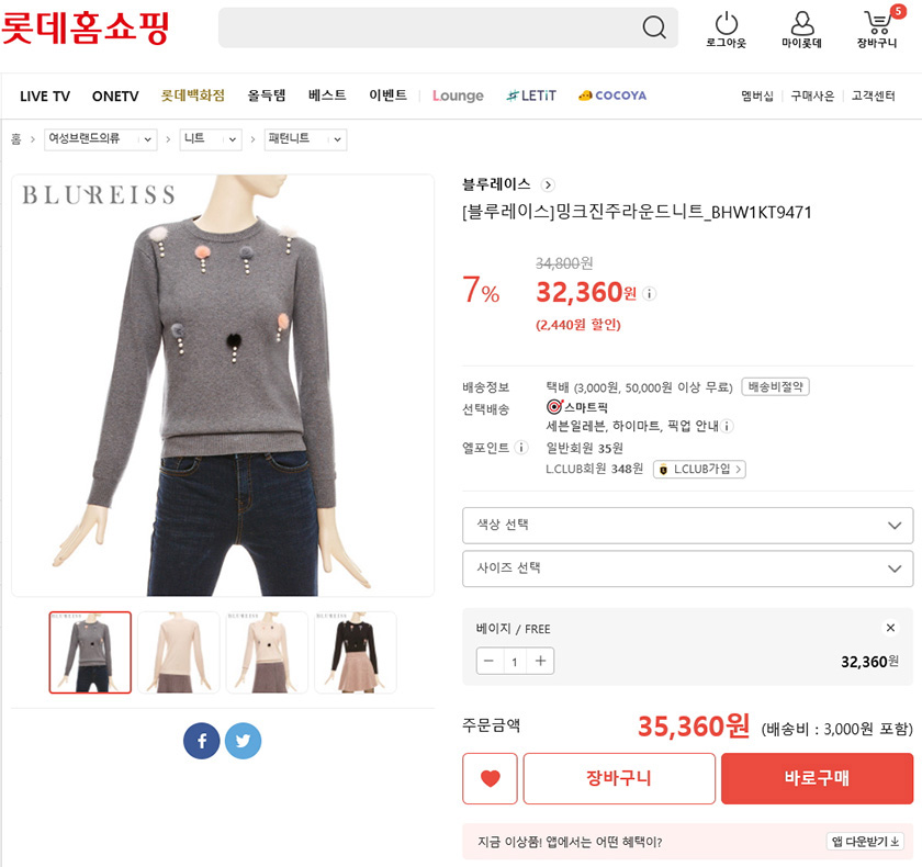 오늘은 롯데홈쇼핑의 블루레이스 밍크진주라운드니트를 소개해 드릴께요ㅎㅎ
