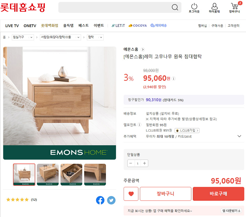 에몬스홈 레미 고무나무 원목 침대협탁 (98,000원 -> 95,060원) 이에요..
