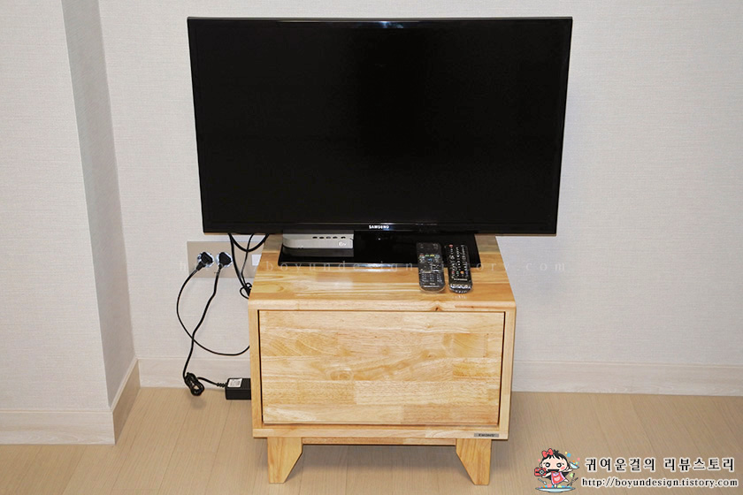에몬스홈 레미 고무나무 원목 침대협탁으로 꾸미고, TV까지 올려 놓으니 안성맞춤이네요^^