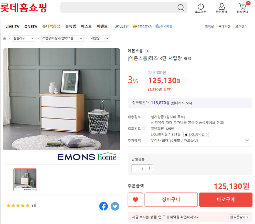 에몬스홈 리즈 3단 서랍장 800 (129,000원 -> 125,130원) 으로 채워보았어요!
