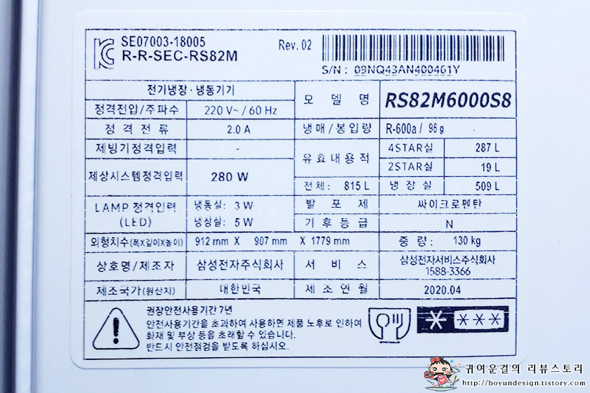 모델명은 RS82M6000S8로 냉동실 306L, 냉장실 509L의 전체용량은 815L에요..