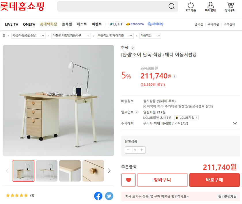 한샘 조이 단독 책상 + 에디 이동서랍장 (224,000원 -> 211,740원) 이에요..