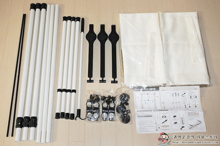 커튼파이프 2개, 상부 하부 각각 기둥 3개, 가로봉 4개, Y형 옷집게, 커튼팔 3개, 커튼 2장,